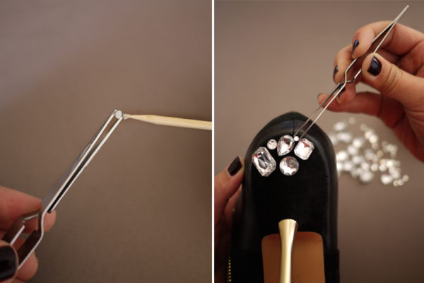 - Using your tweezers, select a gem of choice and dip non shiny, flat surface side into glue.